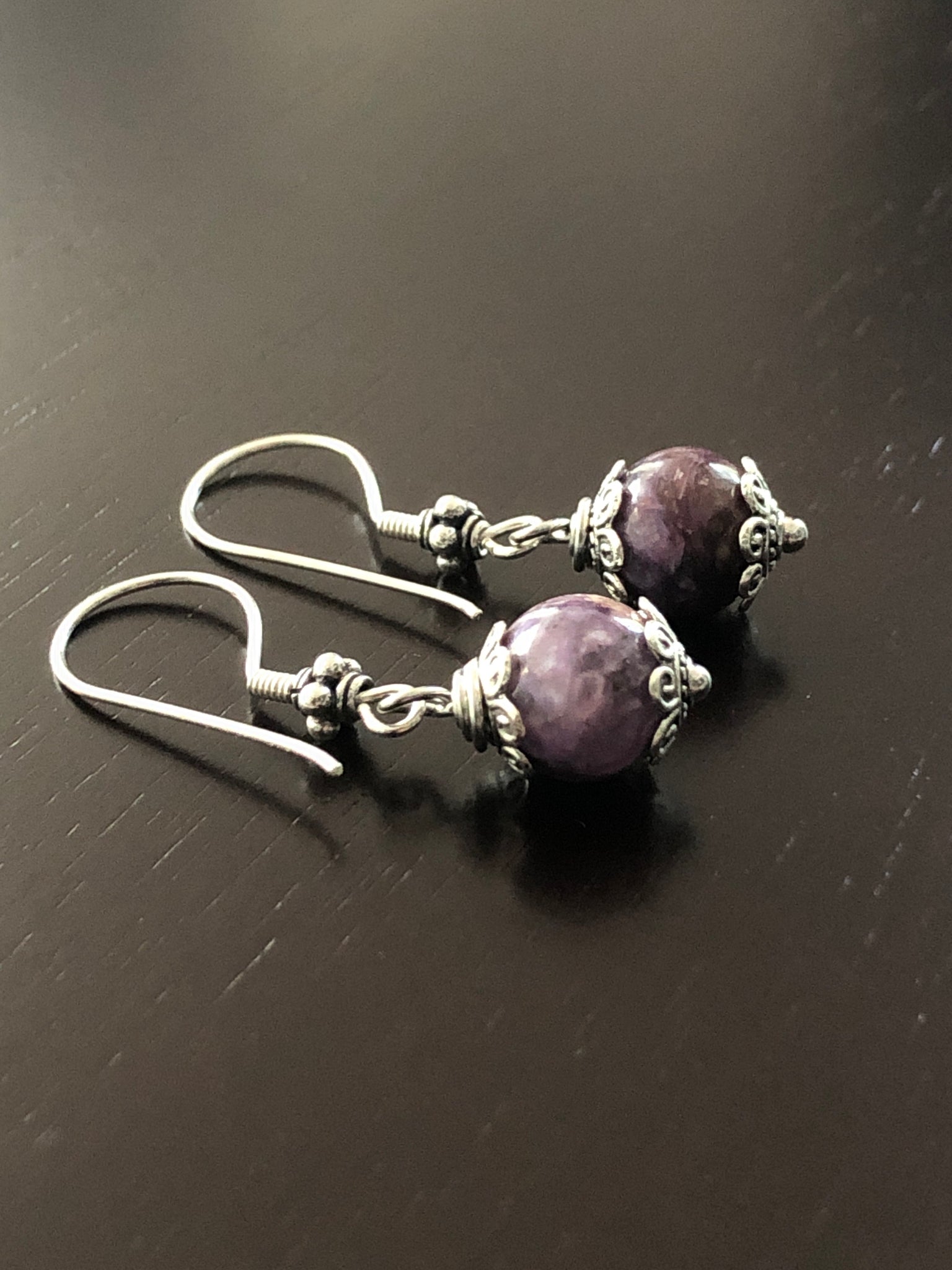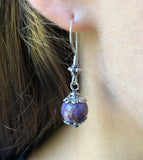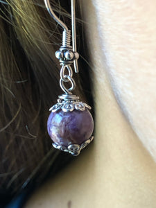 Beautiful Charoite earrings with decorative sterling silver accents. They coordinate with the other Charoite necklaces on this site!