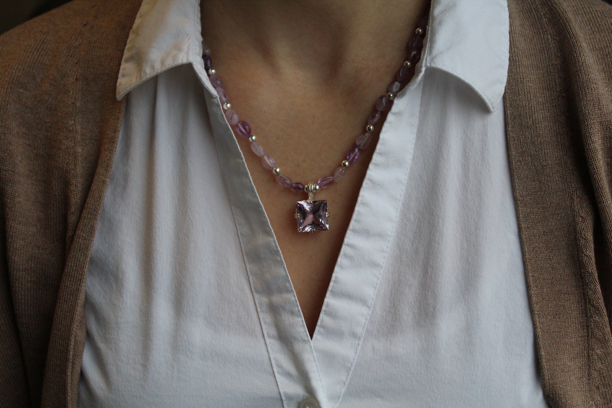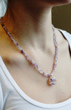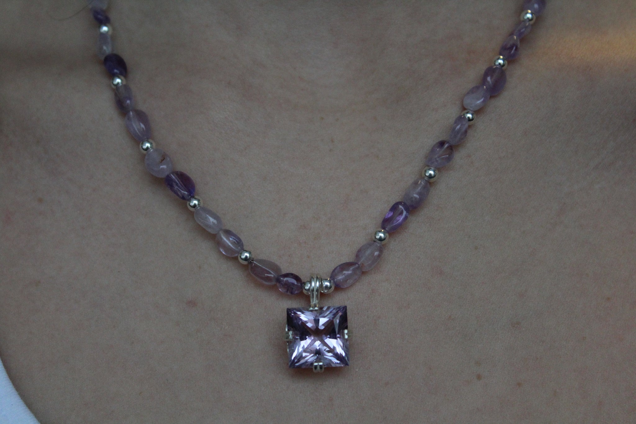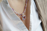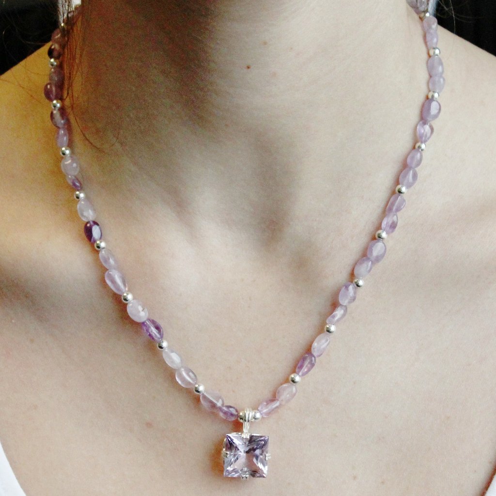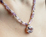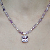 AAA Rated Rose Amethyst stone set in sterling silver sparkles as a centerpiece , complimented by smooth amethyst stones with alternating sterling silver.